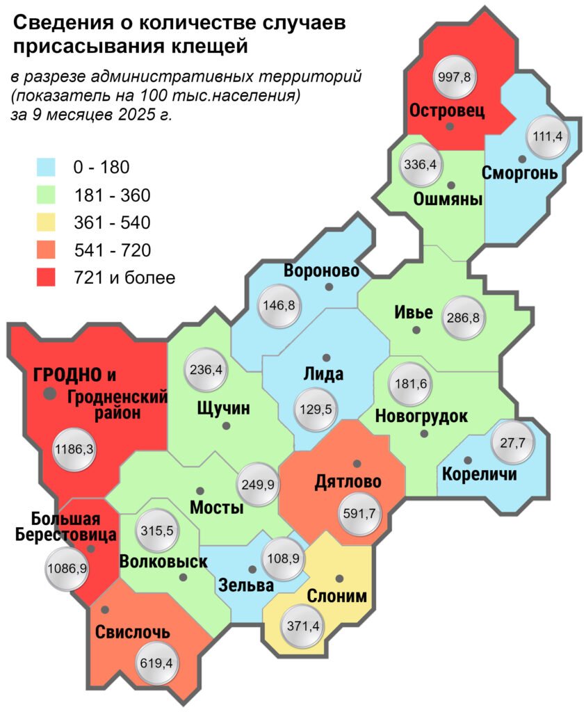 Общее количество присасывания клещей в Гродненской области в 2025 году