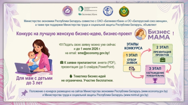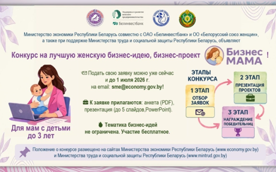 Министерство экономики совместно с Белорусским союзом женщин и ОАО «Белинвестбанк» при поддержке Министерства труда и социальной защиты объявляет о старте конкурса на лучшую бизнес-идею, бизнес-проект «БизнесМАМА».